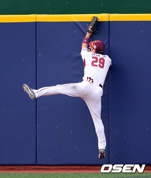 5회초 무사에서 LG 정의윤이 중월 솔로 홈런떄 넥센 이택근이 타구를 잡으려 점프를 하고 있다.