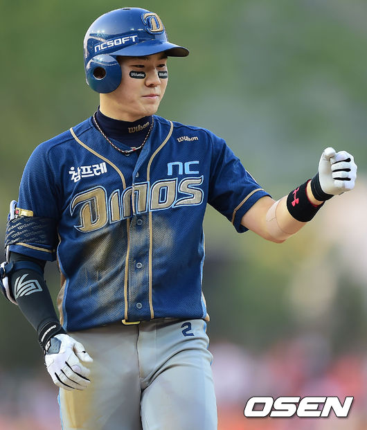 31일 오후 광주-KIA 챔피언스필드에서 열린 2014 한국야쿠르트 세븐 프로야구 KIA 타이거즈와 NC 다이노스의 경기, 5회초 1사 주자 2,3루 NC 박민우가 중견수 앞 역전 2타점 적시타를 날린 후 1루에서 기뻐하고 있다.