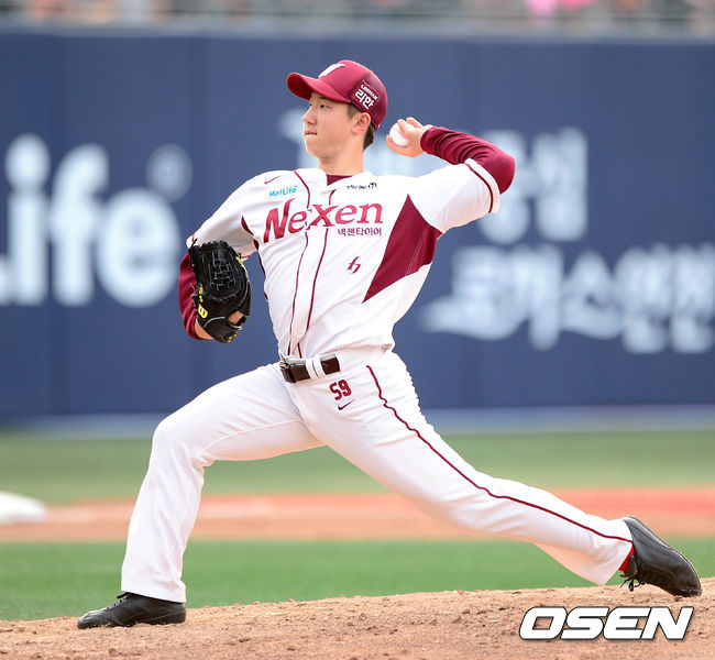 4회초 1사 1,2루에서 넥센 김영민과 교체된 강윤구가 힘차게 공을 던지고 있다.