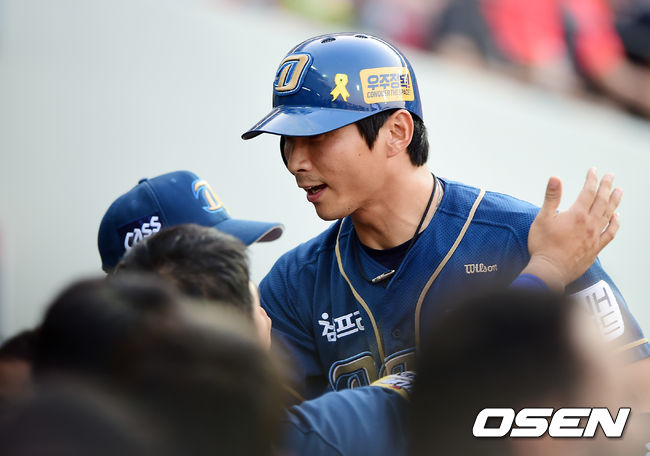 31일 오후 광주-KIA 챔피언스필드에서 열린 2014 한국야쿠르트 세븐 프로야구 KIA 타이거즈와 NC 다이노스의 경기, 5회초 1사 주자 2,3루 NC 박민우의 중견수 앞 역전 2타점 적시타때 홈을 밟은 김종호가 덕아웃에서 동료들과 하이파이브를 하고 있다.