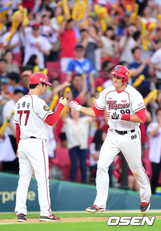 31일 오후 광주-KIA 챔피언스필드에서 열린 2014 한국야쿠르트 세븐 프로야구 KIA 타이거즈와 NC 다이노스의 경기, 5회말 무사 주자 1루 KIA 브렛 필이 좌월 투런 홈런을 날린 후 3루에서 김종국 코치와 하이파이브를 하고 있다.