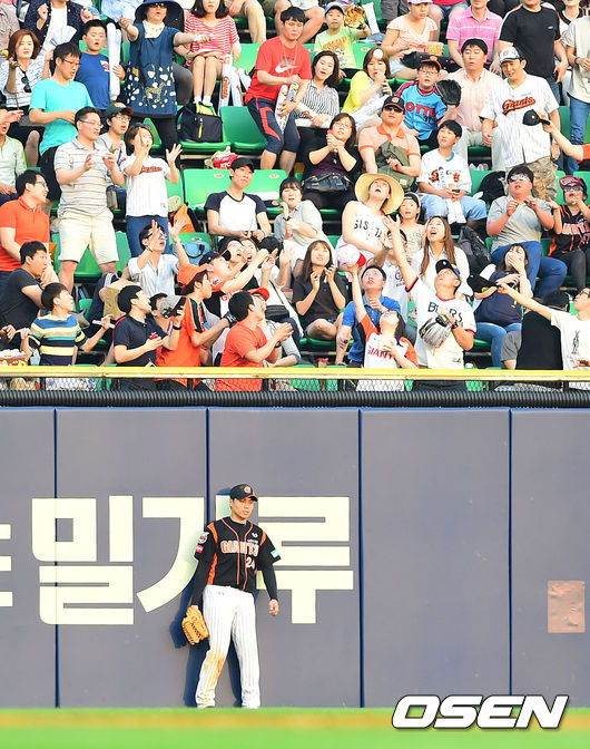 5회말 2사 주자없는 상황에서 이원석의 솔로포에 롯데 외야수 김문호가 허탈해 하고 있다.
