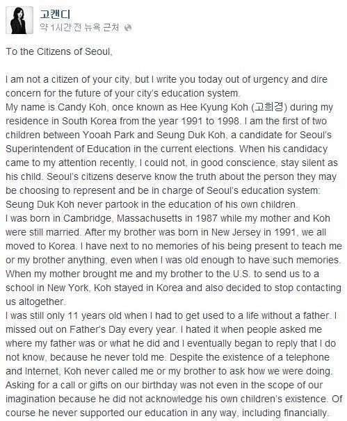 이 글에서 고 씨는 “고승덕 후보는 자신의 자녀의 교육에 참여하기는커녕 연락조차 하지 않았다. 서울시교육감 후보로서 자질이 없다”며 “정확한 진실을 서울시민에게 알리기 위해 페이스북에 글을 올리게 됐다”고 밝혔다.