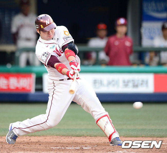 5회말 2사 2루에서 넥센 박병호가 우전 적시타를 치고 있다.