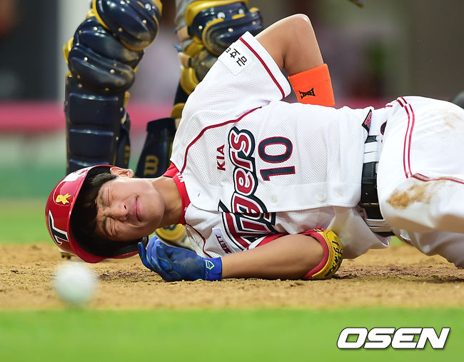 31일 오후 광주-KIA 챔피언스필드에서 열린 2014 한국야쿠르트 세븐 프로야구 KIA 타이거즈와 NC 다이노스의 경기, 5회말 2사 주자 1,2루 KIA 강한울이 몸에 볼을 맞으며 고통스러워하고 있다.