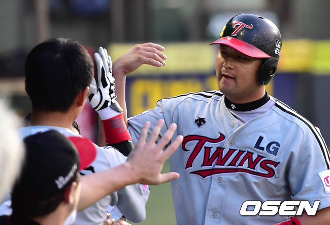 5회말 2사 2루에서 LG 김용의의 적시타때 홈을 밟은 2루주자 최경철이 더그아웃에서 동료들과 환호하고 있다.