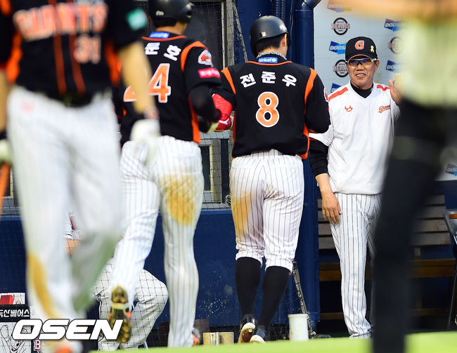 7회초 2사 1,2루 스리런을 때리고 홈을 밟은 전준우가 덕아웃으로 향하고 있다.