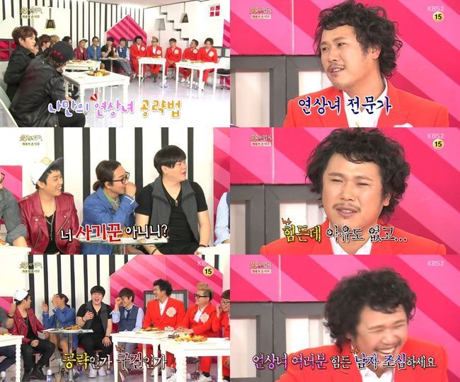 장미여관 육중완은 "연상녀를 많이 만났다. 아홉살 연상까지 만나봤다"며 "계속 힘들다 그랬다. '진짜 힘들다'고 했다. 뭔지 모르겠는데 힘들다고 했다. 그러면 (연상녀들이) 잘해주려고 한다"고 자신만의 비법을 공개했다.