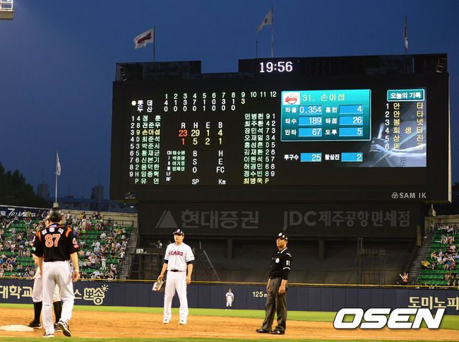 9회초, 롯데가 28안타 신기록을 달성하며 경기를 진행하고 있다.