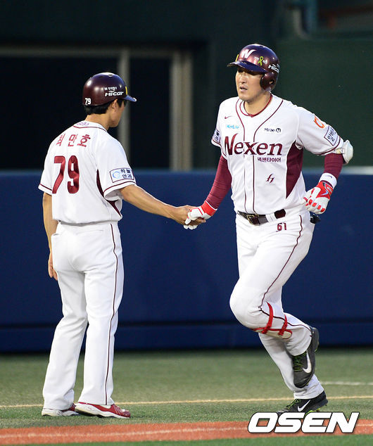 7회말 1사에서 넥센 유한준이 우중월 솔로 홈런을 치고 그라운드를 돌고 있다.