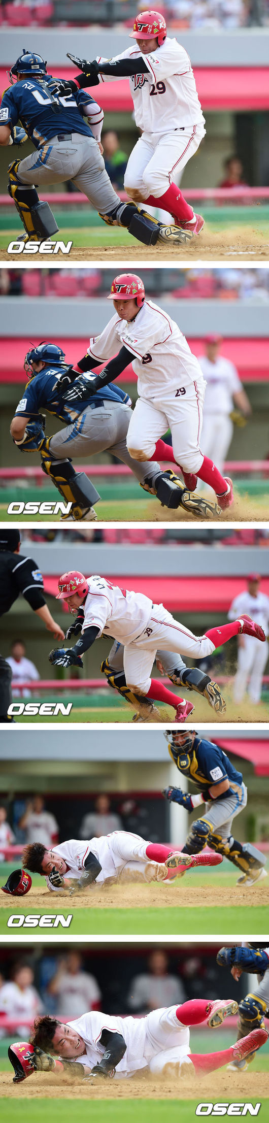 31일 오후 광주-KIA 챔피언스필드에서 열린 2014 한국야쿠르트 세븐 프로야구 KIA 타이거즈와 NC 다이노스의 경기, 4회말 1사 주자 2,3루 KIA 김다원의 유격수 앞 땅볼때 3루 주자 나지완이 홈으로 몸을 던지며 NC 김태군의 다리에 걸리고 있다. KIA 나지완은 홈플레이트를 못밟았지만 NC 김태군이 다리를 뻗은 것이 주루 방해로 인정되며 득점을 올렸다.