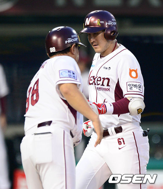 7회말 1사에서 넥센 유한준이 우중월 솔로 홈런을 치고 홈에서 심재학 코치와 하이파이브를 하고 있다.
