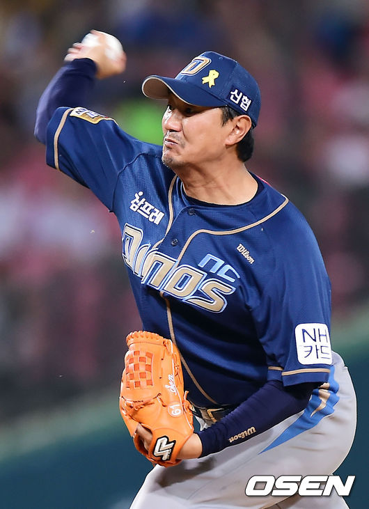 31일 오후 광주-KIA 챔피언스필드에서 열린 2014 한국야쿠르트 세븐 프로야구 KIA 타이거즈와 NC 다이노스의 경기, 8회말 1사 KIA 김주찬 타석에서 마운드에 오른 NC 손민한이 힘차게 공을 뿌리고 있다.