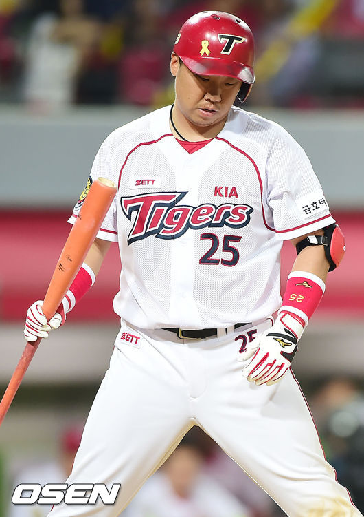 31일 오후 광주-KIA 챔피언스필드에서 열린 2014 한국야쿠르트 세븐 프로야구 KIA 타이거즈와 NC 다이노스의 경기, 8회말 2사 주자 1,2루 KIA 이범호가 타석에서 NC 손민한에게 루킹삼진을 당하며 고개를 떨구고 있다.
