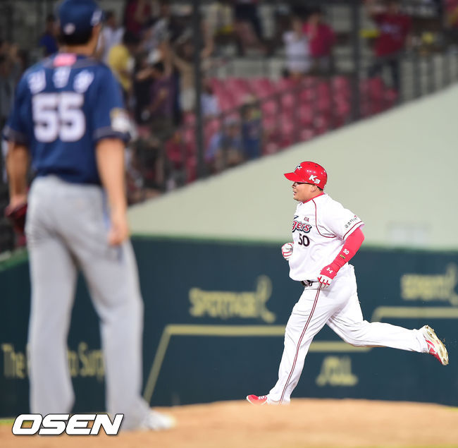 31일 오후 광주-KIA 챔피언스필드에서 열린 2014 한국야쿠르트 세븐 프로야구 KIA 타이거즈와 NC 다이노스의 경기, 9회말 KIA 선두타자 이종환이 우월 솔로홈런을 날린 후 그라운드를 돌고 있다.