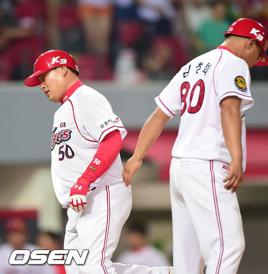 31일 오후 광주-KIA 챔피언스필드에서 열린 2014 한국야쿠르트 세븐 프로야구 KIA 타이거즈와 NC 다이노스의 경기, 9회말 KIA 선두타자 이종환이 우월 솔로홈런을 날린 후 홈에서 김창희 코치와 하이파이브를 하고 있다.