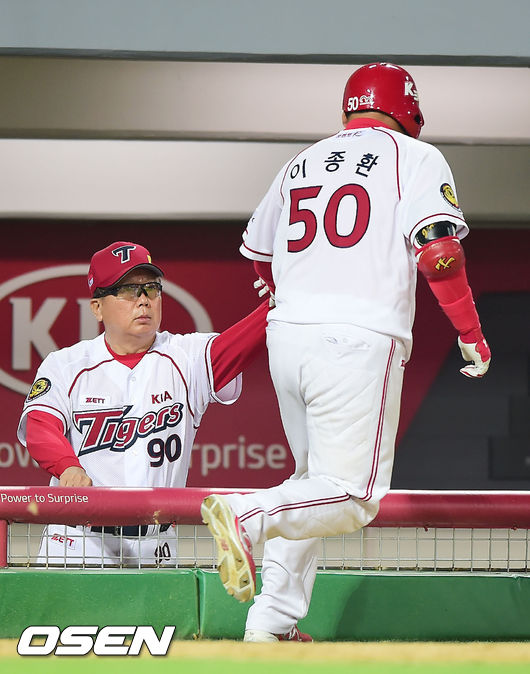 31일 오후 광주-KIA 챔피언스필드에서 열린 2014 한국야쿠르트 세븐 프로야구 KIA 타이거즈와 NC 다이노스의 경기, 9회말 KIA 선두타자 이종환이 우월 솔로홈런을 날린 후 덕아웃에서 선동렬 감독과 하이파이브를 하고 있다.