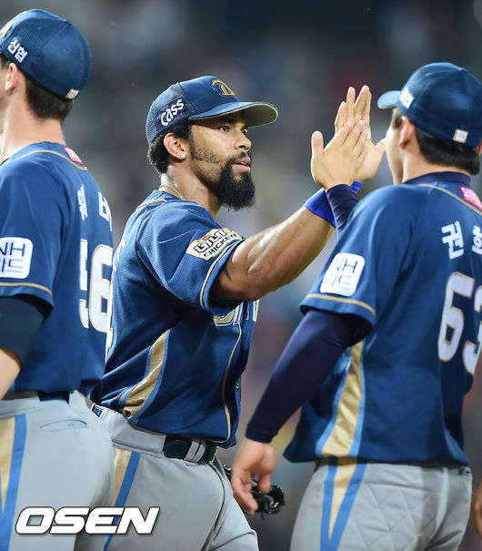 경기를 마치고 NC 테임즈가 동료들과 하이파이브를 하고 있다. / rumi@osen.co.kr