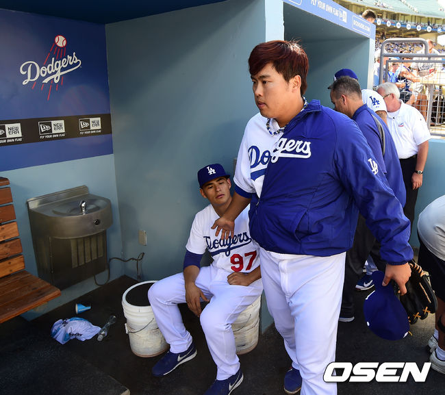 경기에 앞서 다저스 류현진이 더그아웃에 들어서며 경기를 준비하고 있다.