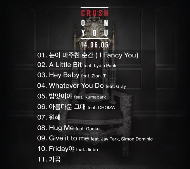 크러쉬가 첫 정규 앨범 ‘크러쉬 온 유(Crush On You)’의 트랙리스트를 공개하고 팬들의 기대감을 높였다.