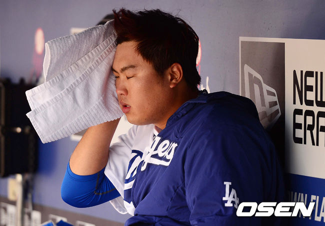 1회초 수비를 마친 다저스 류현진이 더그아웃에서 땀을 닦고 있다.