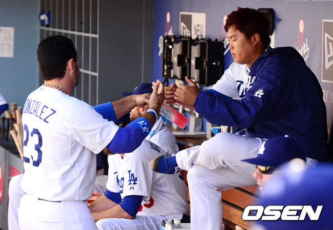 1회초 수비를 마친 다저스 류현진이 더그아웃에서 곤잘레스와 파이팅을 하고 있다.