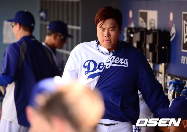 경기에 앞서 다저스 류현진이 더그아웃에서 경기를 준비하고 있다.