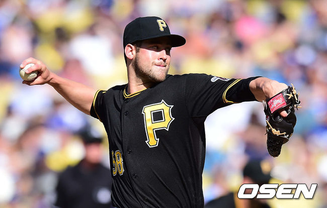 1회말 피츠버그 브랜든 컴톤이 역투하고 있다.