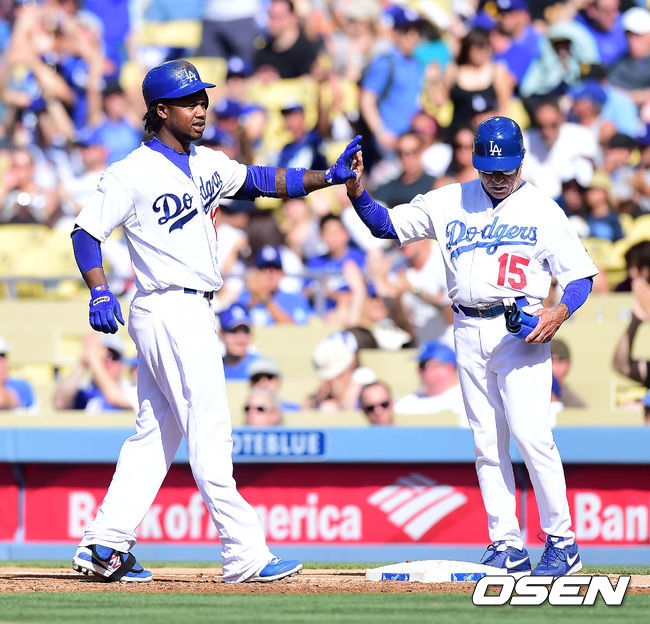 1회말 2사 2루에서 다저스 라미레즈가 선제 좌전 적시타를 날리고 기뻐하고 있다.