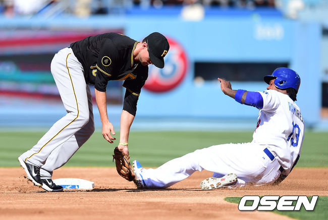 1회말 2사 1루에서 다저스 라미레즈가 2루 도루에 성공하고 있다.