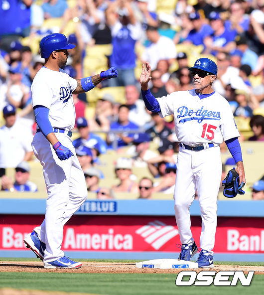 1회말 2사 1, 2루에서 다저스 맷 켐프가 1타점 좌전 적시타를 날리고 기뻐하고 있다.