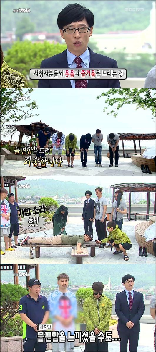 유재석은 ‘무한도전’을 대표해 “예능의 기본은 웃음을 드리는 것이다. 불편함을 드려서 죄송하다. 리더인 내가 책임을 져야겠다. 내가 먼저 곤장을 맞겠다”고 사과한 후 곤장을 맞았다. 엉덩이에 곤장이 닿았을 때 나는 찰진 소리와 함께 녹화 시간 30분 지각을 한 하하도 엉덩이를 들이밀었다.