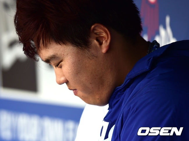 4회초 1실점을 허용한 다저스 류현진이 수비를 마치고 더그아웃에서 쓴웃음을 짓고 있다.