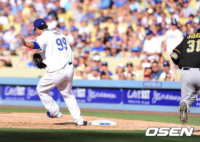 4회초 2사에서 다저스 류현진이 피츠버그 타바타의 1루 땅볼에 베이스 커버를 들어가고 있다. 곤잘레스의 송구가 타바타에 향하며 내야안타 허용.