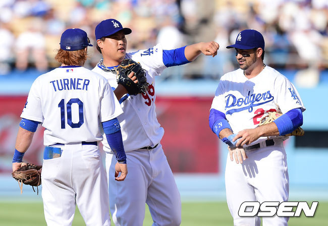 4회초 1사에서 다저스 류현진이 피츠버그 마르테를 1루 땅볼로 처리하며 터너, 곤잘레스와 이야기 나누고 있다.