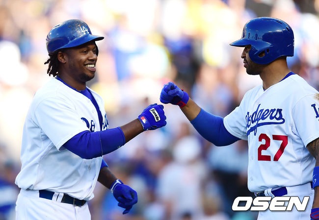 4회말 2사 1루에서 다저스 라미레즈가 투런포를 날리고 기뻐하고 있다.