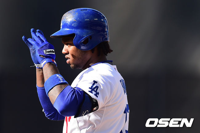 3회말 무사 1,3루에서 다저스 라미레즈가 1타점 좌전 적시타를 날리고 세레모니를 하고 있다.