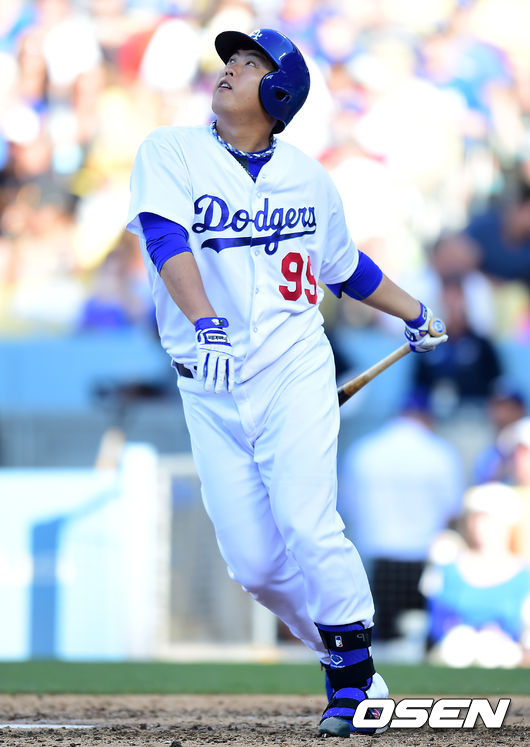 4회말 2사 3루에서 다저스 류현진이 우익수 플라이 날리고 타구를 바라보고 있다.