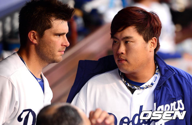 4회초 종료 후 류현진이 덕아웃에서 부테라와 이야기를 나누고 있다. /baik@osen.co.kr
