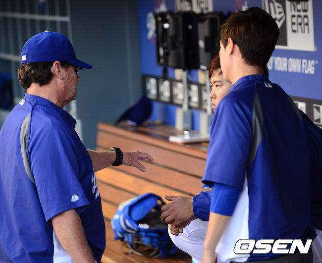 류현진이 허니컷 코치와 이야기를 나누고 있다. /baik@osen.co.kr