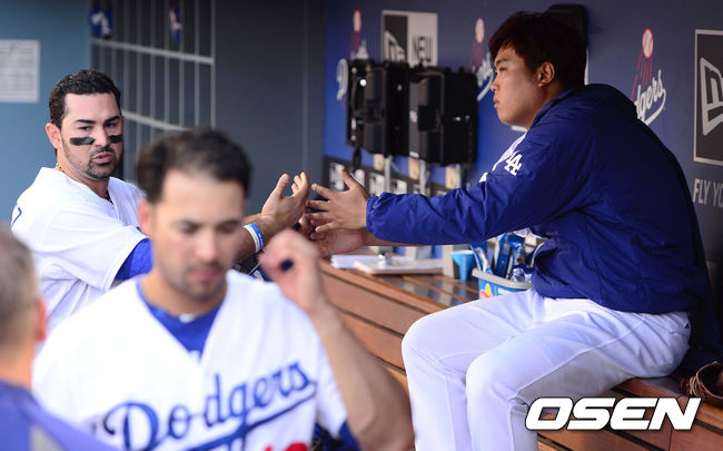 곤잘레스가 류현진과 하이파이브를 하고 있다./baik@osen.co.kr