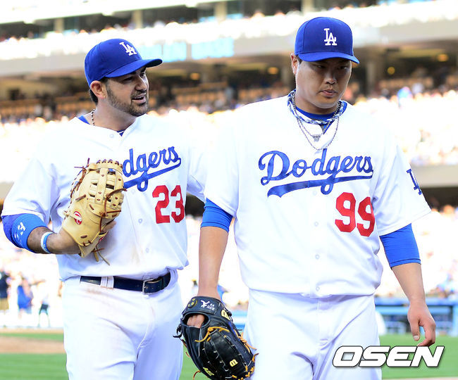6회초 종료 후 류현진이 덕아웃으로 향하며 곤잘레스의 격려를 받고 있다. /baik@osen.co.kr