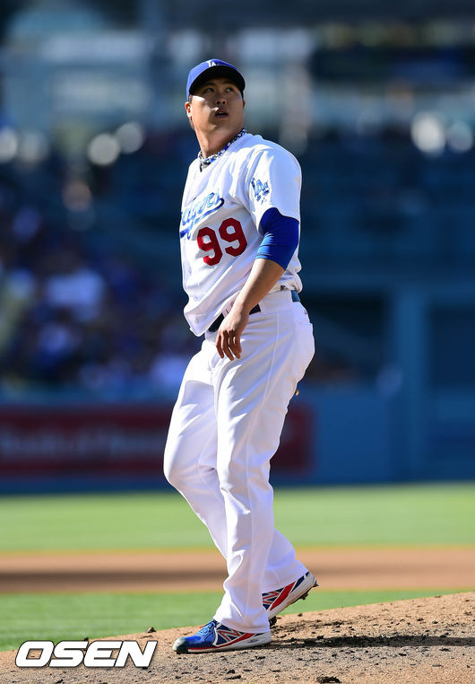 3회초 류현진이 맥커친의 뜬공을 바라보고 있다. /baik@osen.co.kr