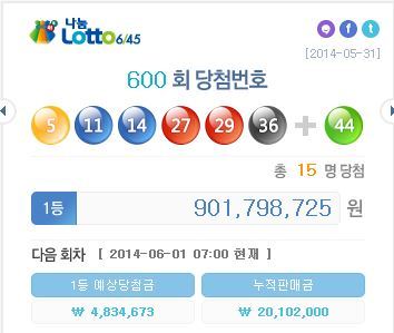 나눔로또에서 발표한 로또 600회 당첨번호는 5, 11, 14, 27, 29, 36, 보너스번호는 44이다.