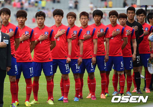 이광종 감독이 이끄는 23세 이하 축구 대표팀(U-23)이 1일 오후 인천아시아드주경기장에서 쿠웨이트와의 친선 경기를 가졌다. 대표팀이 국기에 대한 경례를 하고 있다.