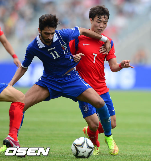 이광종 감독이 이끄는 23세 이하 축구 대표팀(U-23)이 1일 오후 인천아시아드주경기장에서 쿠웨이트와의 친선 경기를 가졌다. 한국 안용우가 볼 다툼을 하고 있다.