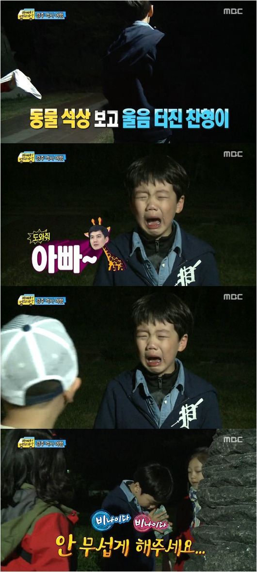 임찬형은 1일 방송된 MBC 예능프로그램 ‘일밤-아빠 어디가’에서 다른 아이들과 함께 야밤 탐험에 나섰다. 이 과정에서 임찬형은 동물 석상을 본 후 눈물을 터뜨렸다.