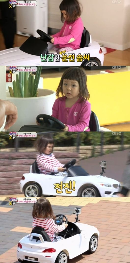 이에 사랑이는 밖으로 나가 본격적으로 자동차를 탔다. 하지만 사랑이는 벤치 등의 구조물에 계속해서 부딪혀 아빠의 도움을 받아야했다.