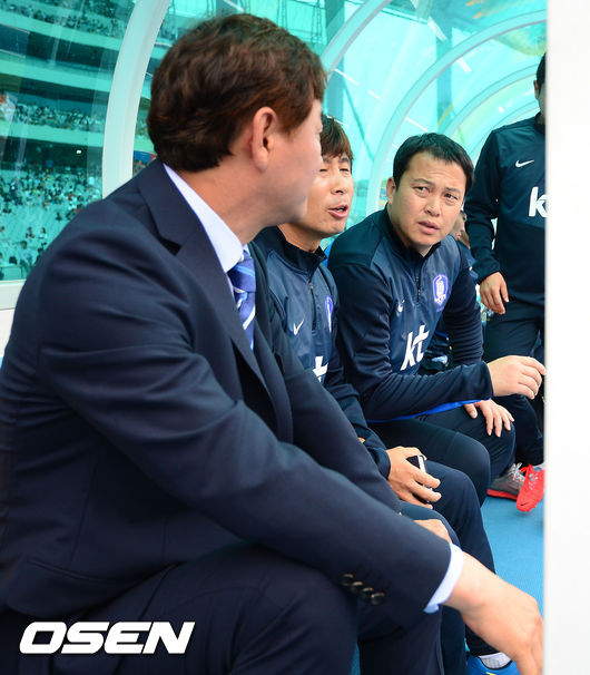 이광종 감독이 이끄는 23세 이하 축구 대표팀(U-23)이 1일 오후 인천아시아드주경기장에서 쿠웨이트와의 친선 경기를 가졌다. 이운재 코치가 이광종 감독과 얘기를 나누고 있다.
