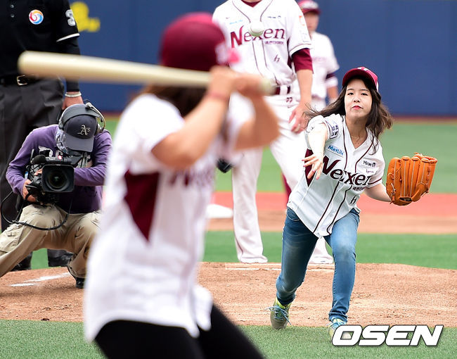 경기에 앞서 이화여자대학교 야구동아리 플레이걸스 백창은, 조정환 양이 시구, 시타를 하고 있다.